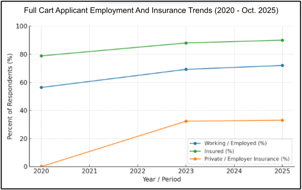 According to U.S. Hunger’s internal analysis of Full Cart application data, the program has logged 272,434 applicants since 2020, including 148,067 since 2023, when comprehensive health-related social-needs tracking began. Among those reporting employment status during 2023–2025, 69 percent were working, and 88 percent reported having health insurance. Of those insured, nearly one-third (32 percent) held private or employer-sponsored plans.